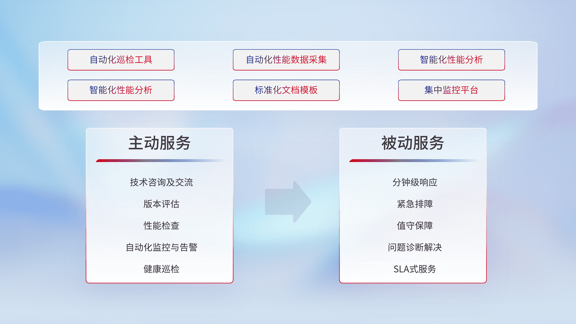 智能化工具和标准化文档,,,,保障服务质量,,,提供主动服务(包含技术咨询、、版本评估、、性能检查、、、、自动化监控与告警、、健康巡检)和被动服务包含(分钟级响应、、、、紧急排障、、、值守保障、、、问题诊断解决、、、SLA服务)。。。。